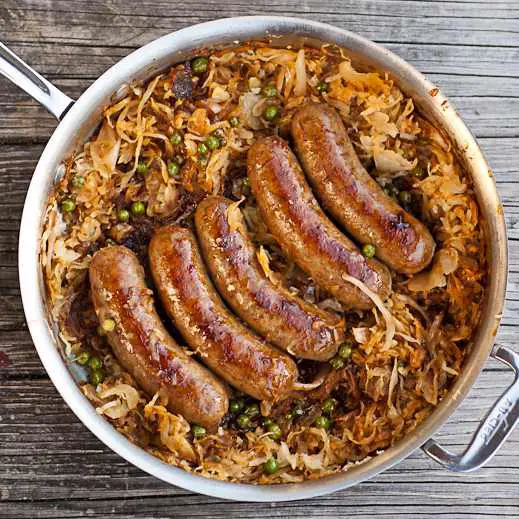 Beer Braised Bratwurst And Caramelized Sauerkraut >>>View the full recipe here.